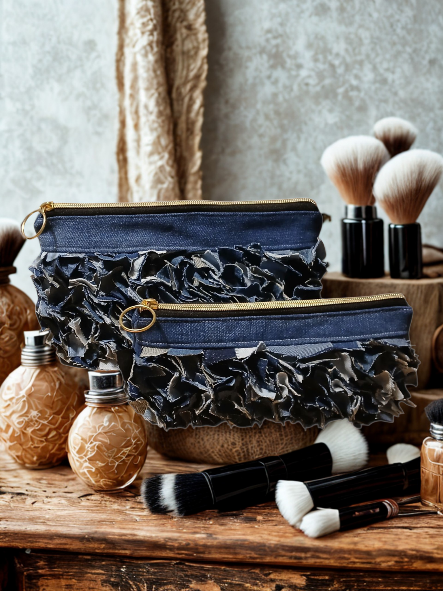 These bags are made from denim taken from thrifted jeans. The front of each bag features a textured design created by using many 1-inch squares to create this fringe like pattern.