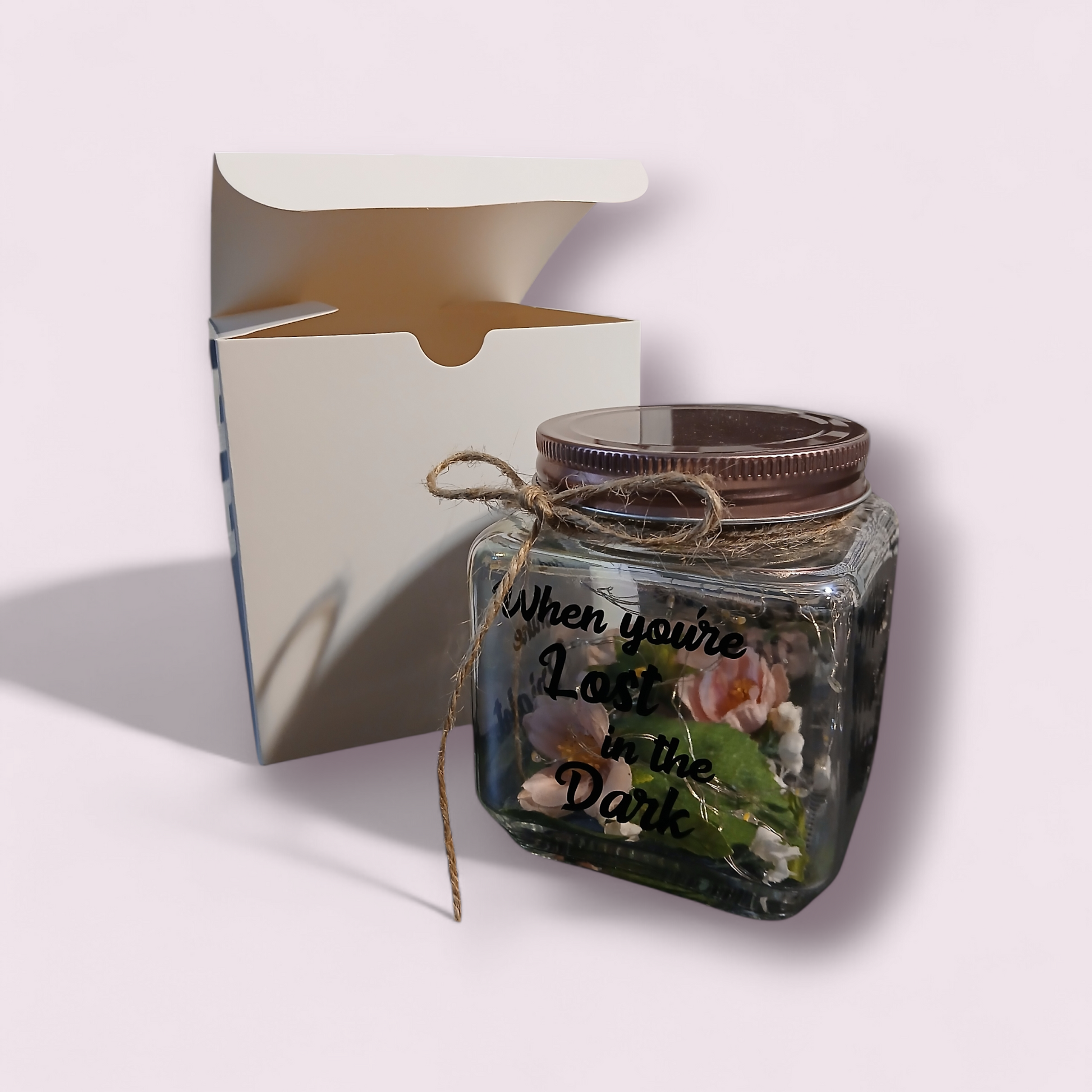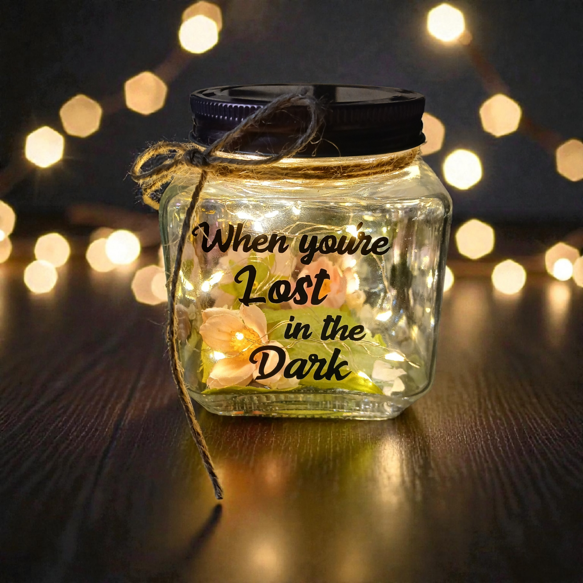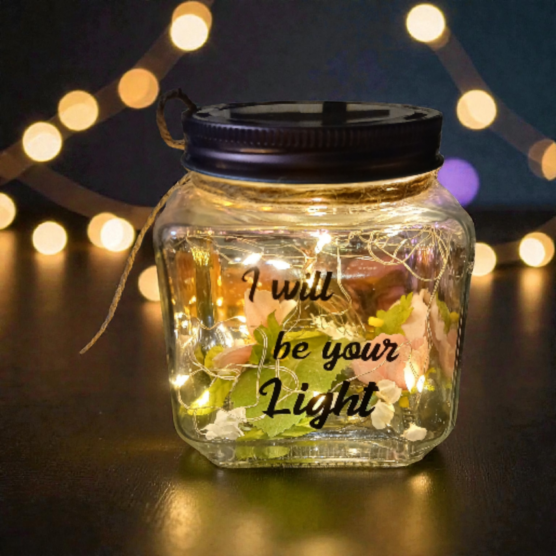 Includes 1 Illuminant jar with fairy lights. Each side of the jar has one verse of the poem, "When you're lost in the dark, I will be your light, know that you are worthy, and Shine Bright." Fairy lights are battery powered.