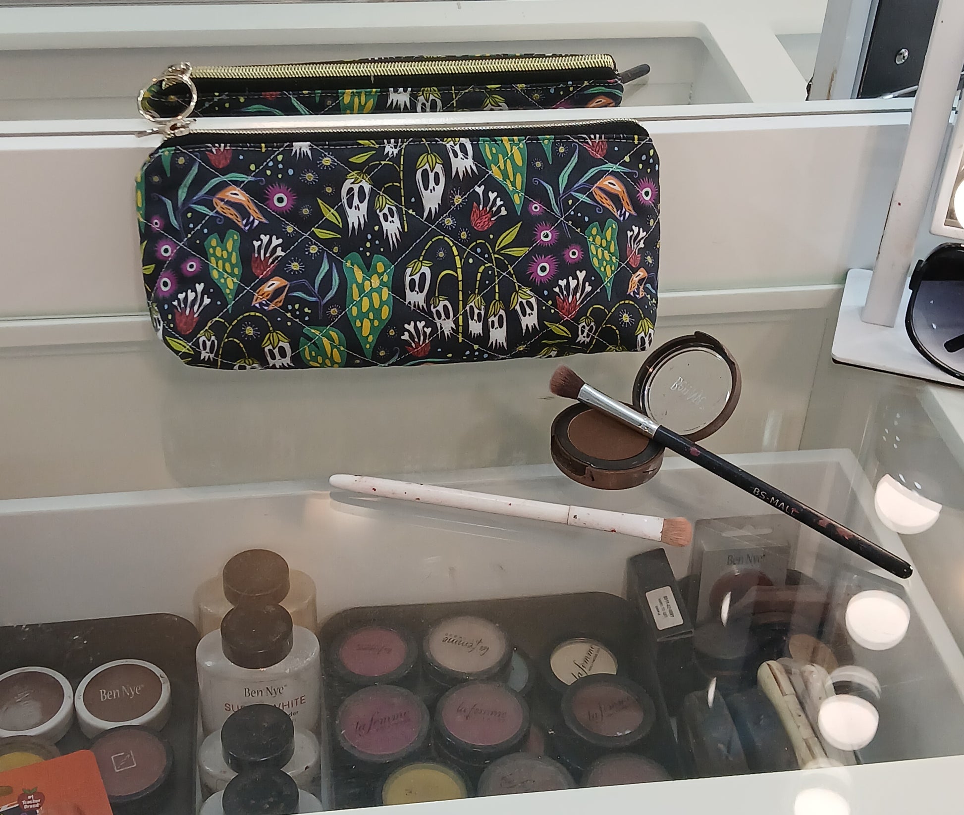 This makeup bag is made from cotton fabric and is 10" long, 4" tall, and 2" wide. The fabric design for this bag is called The Odd Garden and was created by illustrator and graphic artist Jacqueline Hurd. Follow her at www.instagram.com/jmhurd.